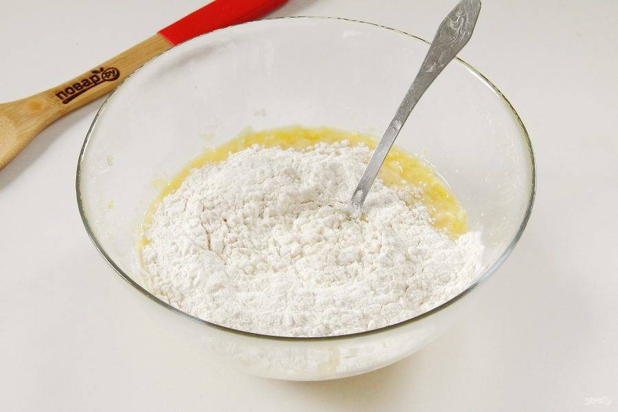Перемешайте все до однородного состояния. Тесто должно быть достаточно вязким, как густая сметана. Если необходимо, то добавьте еще муки.