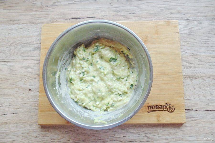 Хорошо перемешайте овощи с мукой до консистенции теста для оладий.