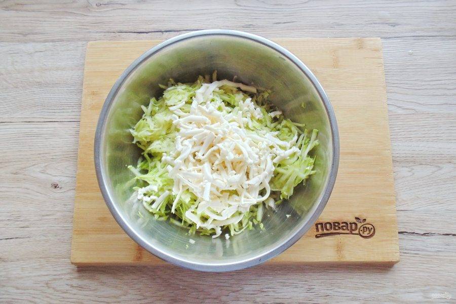 Кабачок вымойте и натрите на тёрке. Если кабачок крупный — лучше его сперва очистить. Переложите в миску.