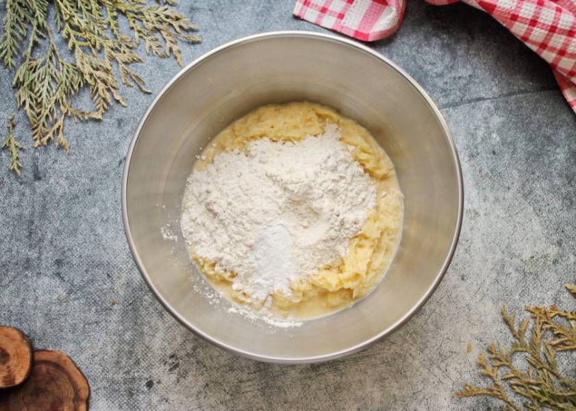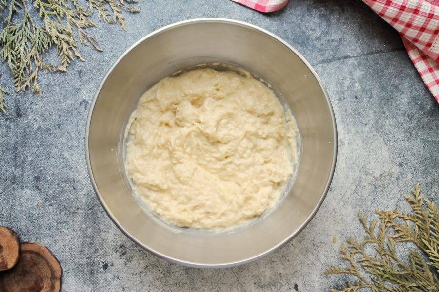Муку смешайте с разрыхлителем, просейте в массу и перемешайте.