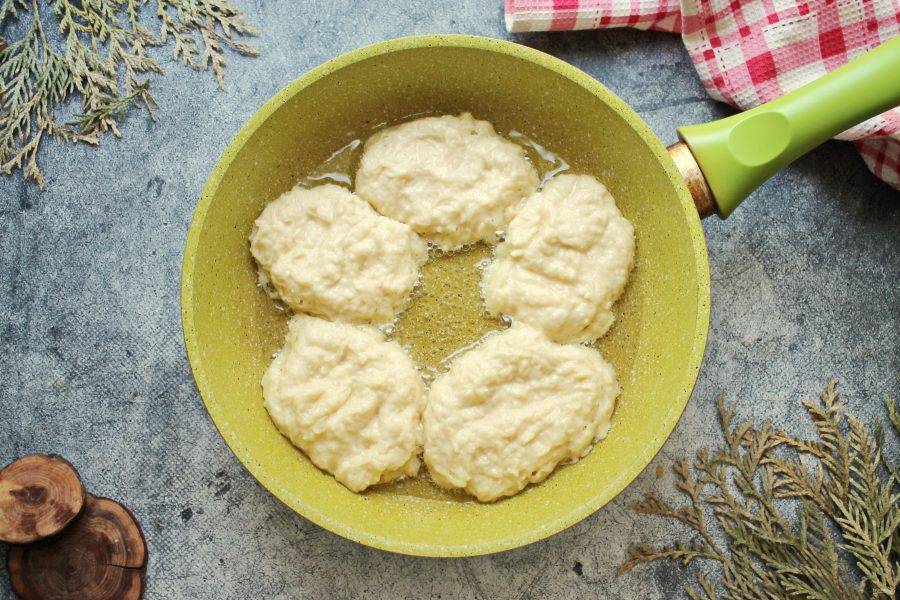 В сковороду налейте растительное масло и разогрейте на среднем огне. Выложите тесто с патиссонами по одной столовой ложке на расстоянии, формируя оладьи. Обжаривайте на медленном огне под крышкой в течение 2-3 минут с каждой стороны.