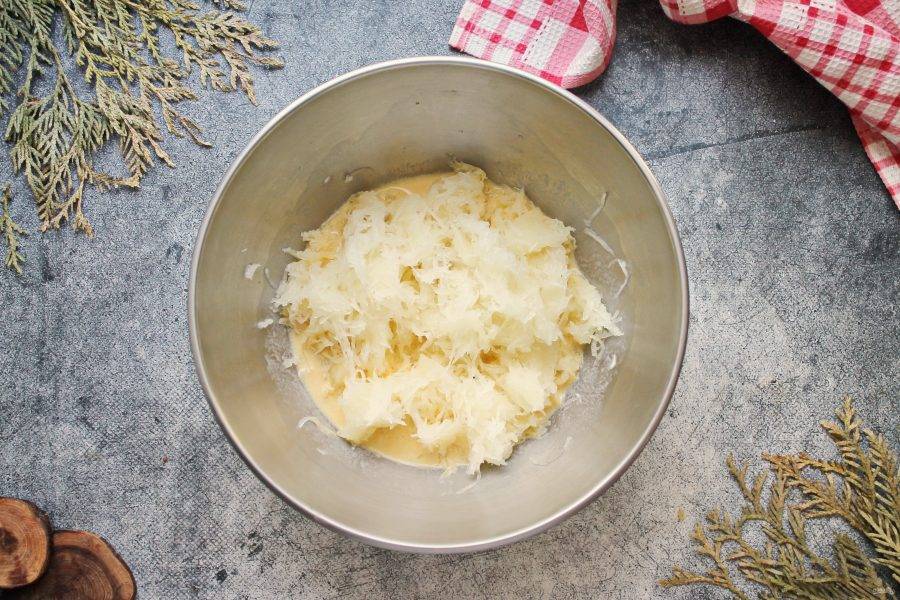 Патиссоны отожмите от сока и добавьте в миску, перемешайте.