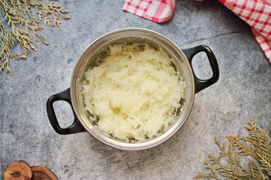Патиссон очистите от кожуры, семян и натрите на средней терке. Добавьте немного соли, перемешайте и оставьте на 10 минут, чтобы выделился сок.