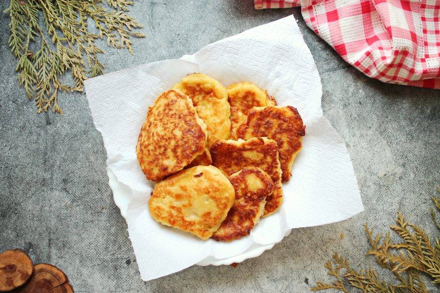 Готовые оладьи выложите на бумажное полотенце на несколько минут, чтобы убрать лишнее масло.