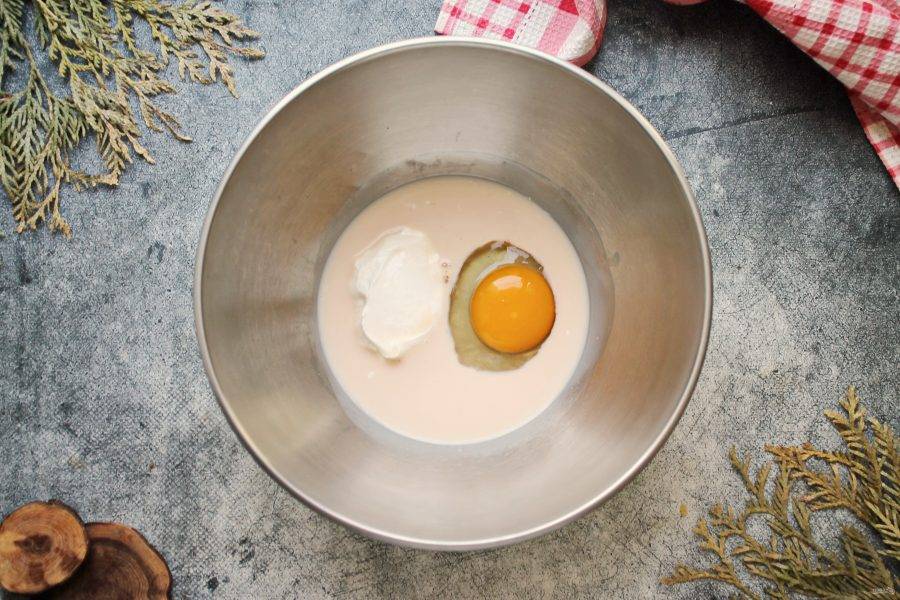 В миску налейте молоко, разбейте яйцо, добавьте соль, сахар, сметану и перемешайте до однородности.