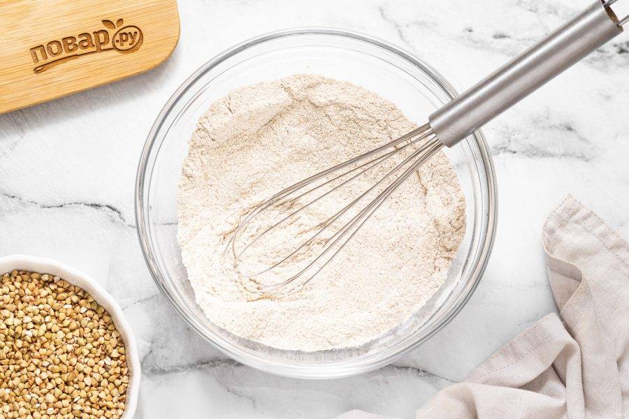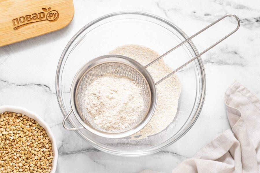 В глубокой миску просейте получившуюся муку из зеленой гречки. Крупные частички, которые останутся в сите, можно еще раз перемолоть и просеять.