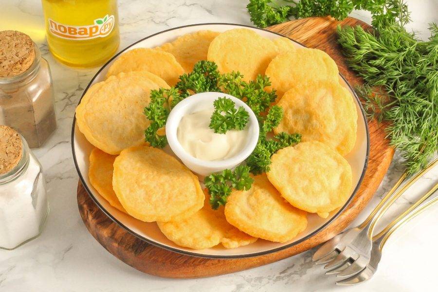 Выложите румяные оладьи из икры сома на тарелку и подайте к столу со сметаной или чесночным соусом.