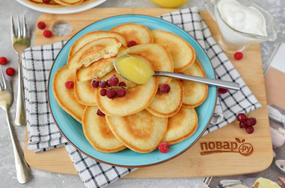 Подавайте оладушки со сметаной, медом, джемами. Приятного аппетита!