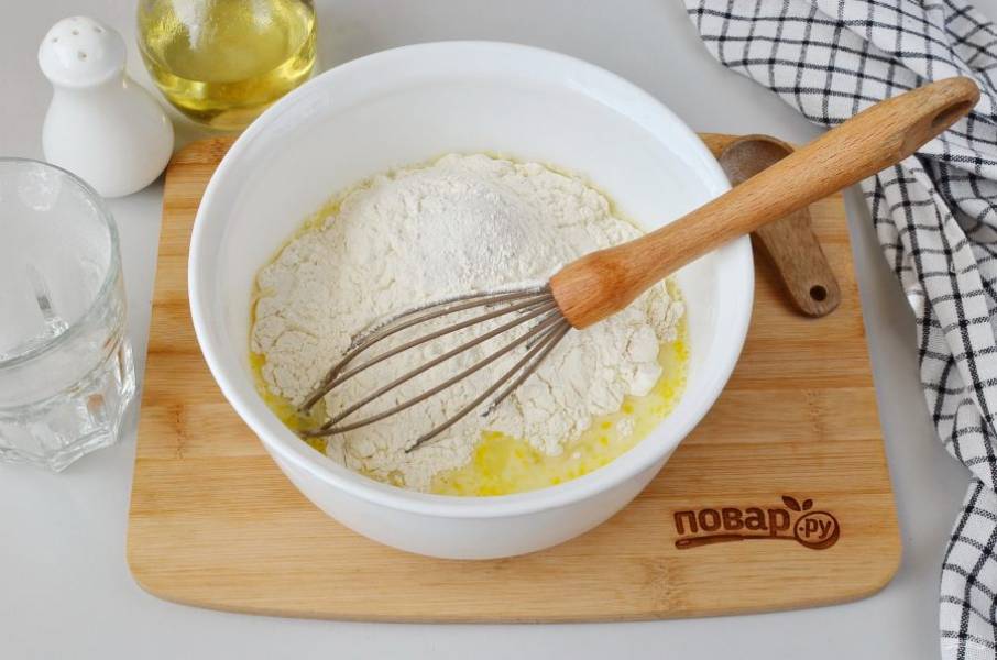 Всыпьте просеянную муку, добавьте разрыхлитель. Венчиком перемешайте хорошо массу до однородности.