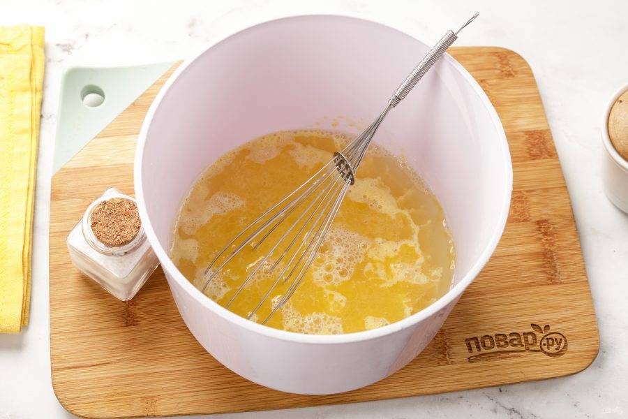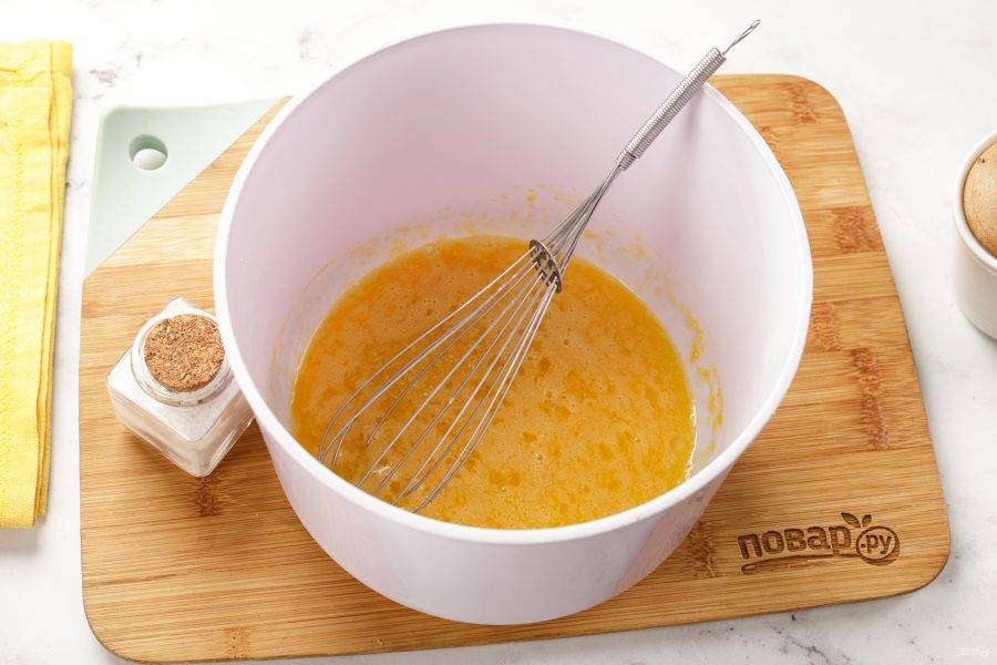 В глубокой миске взбейте яйца с сахаром, солью и ванилином.