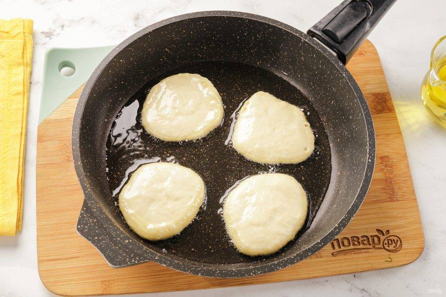 Сковороду хорошо разогрейте на сильном огне. Налейте на неё немного растительного масла. Выкладывайте тесто ложкой, формируя круглые оладушки. Жарьте их до румяности на одной стороне, затем переверните и жарьте на другой.