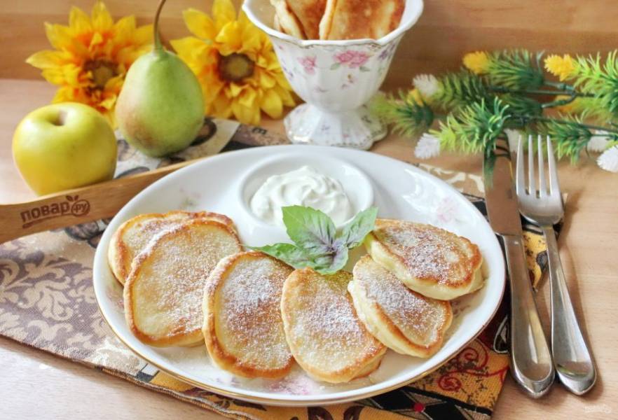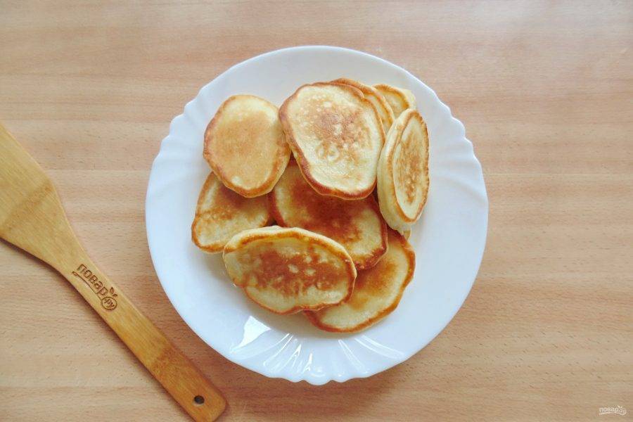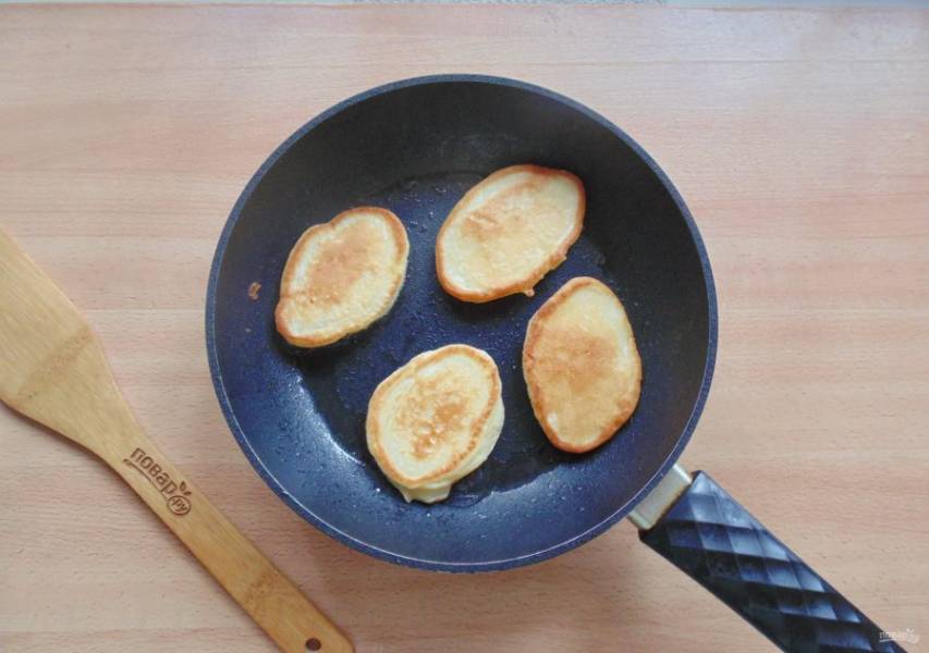 Жарьте оладьи с обеих сторон до золотистого цвета.