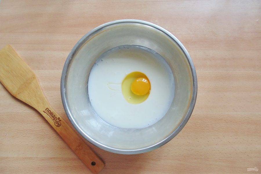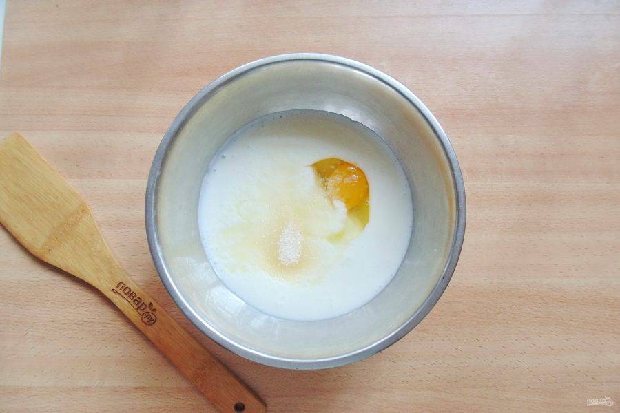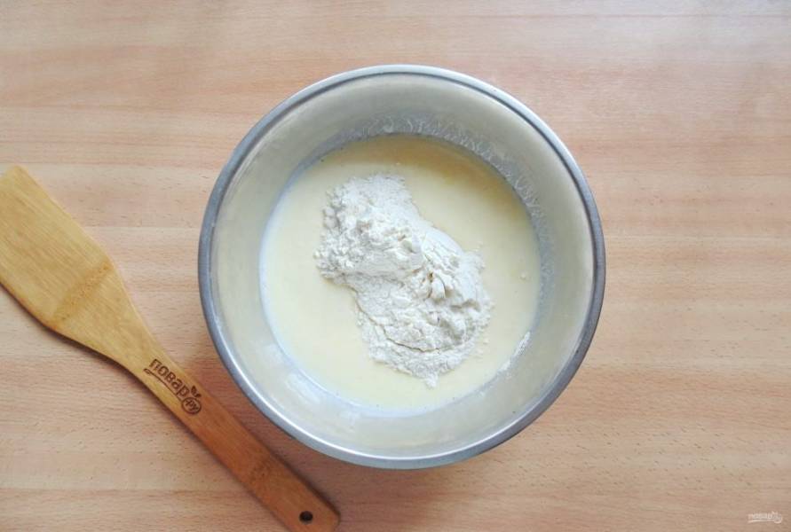 Сюда же добавьте соль, сахар и соду. Хорошо перемешайте.
