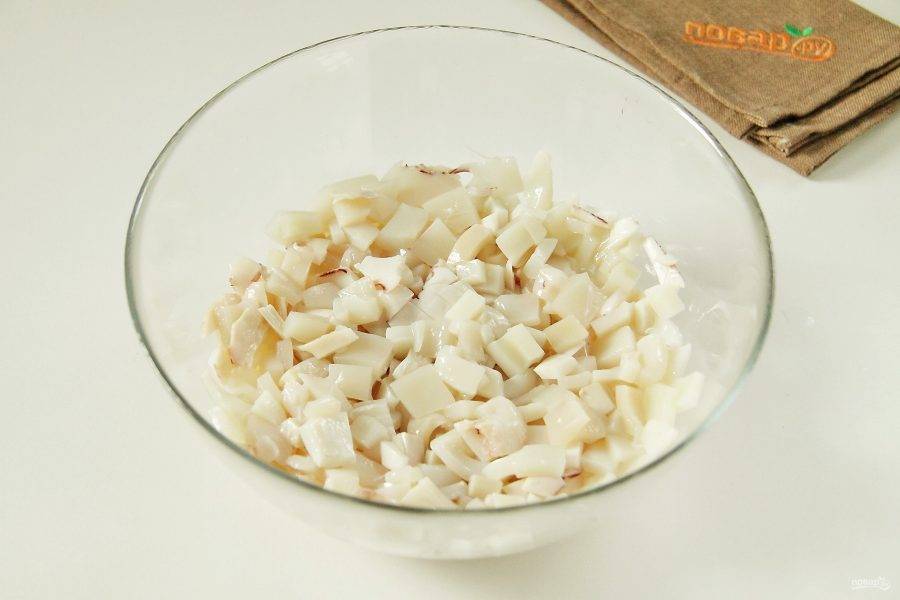 Заранее отваренные кальмары нарежьте мелкими кубиками и сложите в глубокую миску.