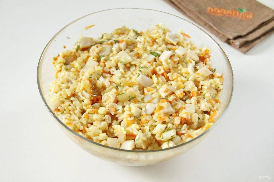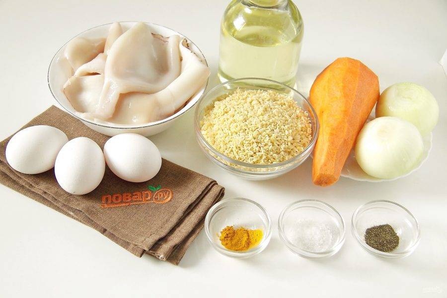 Интересный рецепт оладий с кальмарами. Тесто будем готовить из мелких макаронных изделий, лука, моркови и зелени. Оладьи получаются очень вкусные, нежные и сытные.