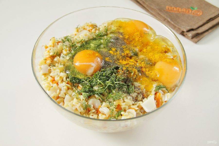 Добавьте яйца, зелень, соль, куркуму и перец.