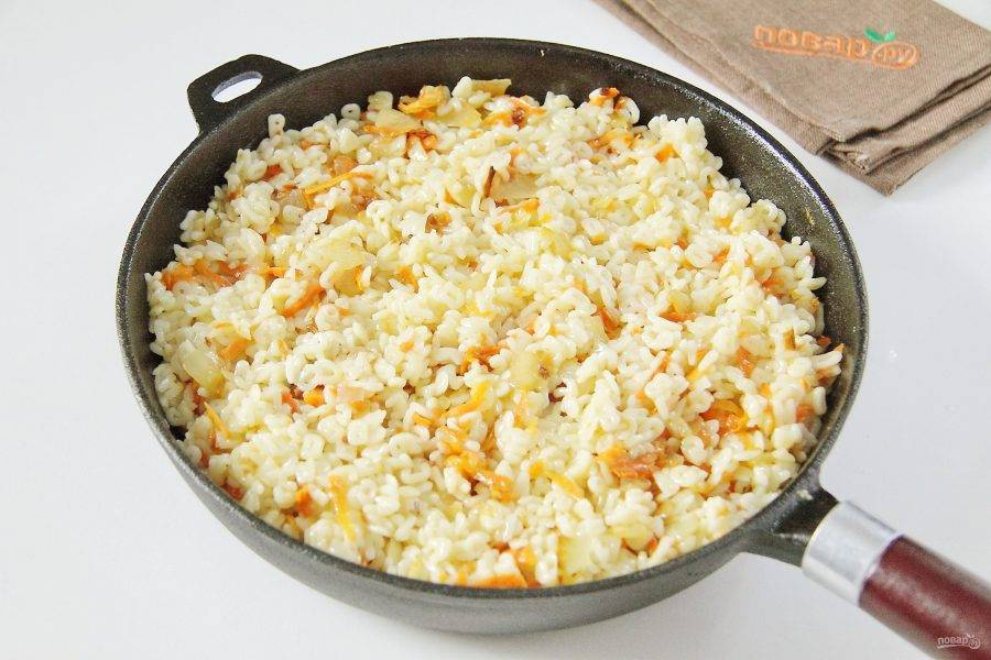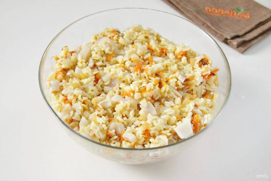 Добавьте сюда же содержимое сковороды и все перемешайте.
