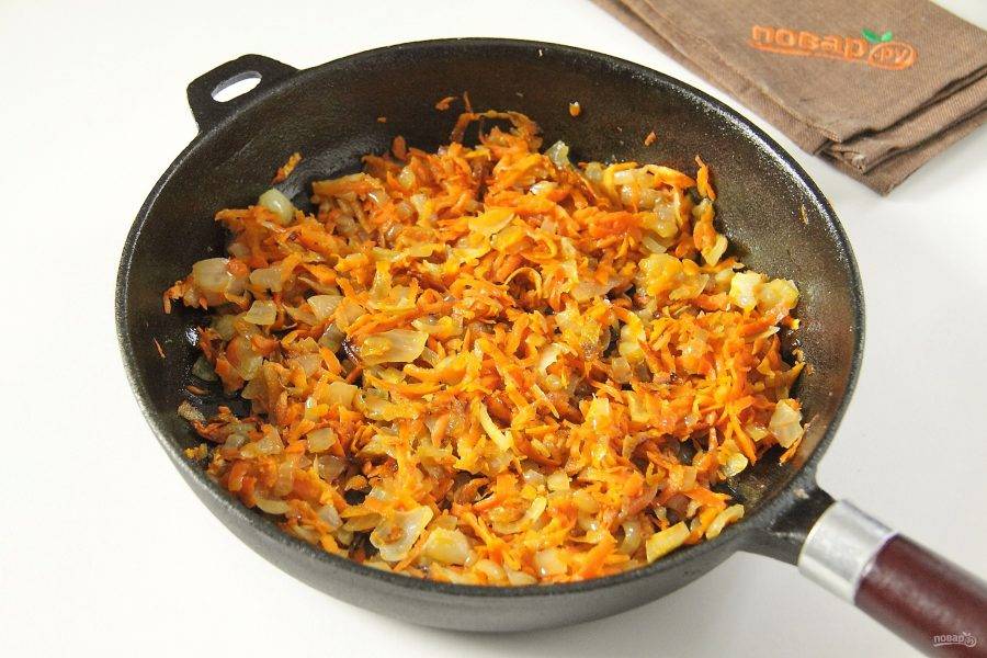 Лук нарежьте кубиками. Морковь натрите на терке. Обжарьте овощи на сковороде до готовности.