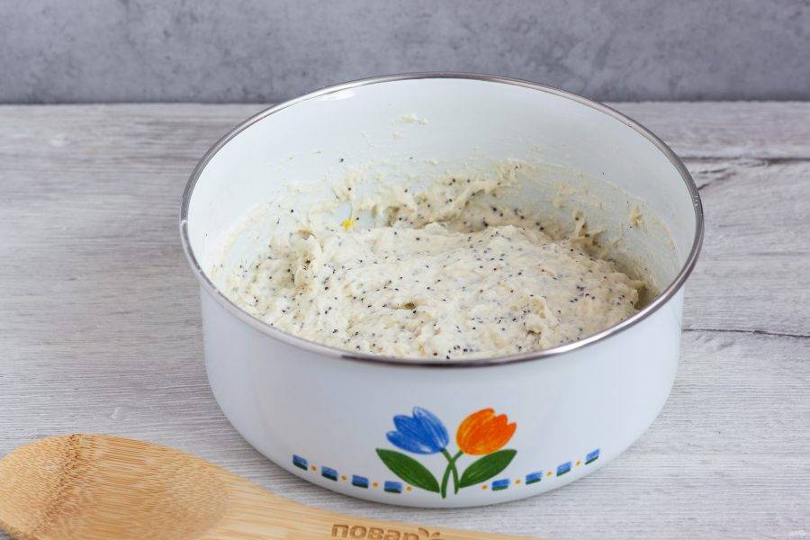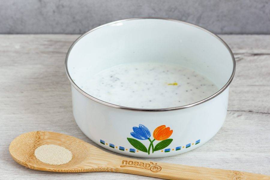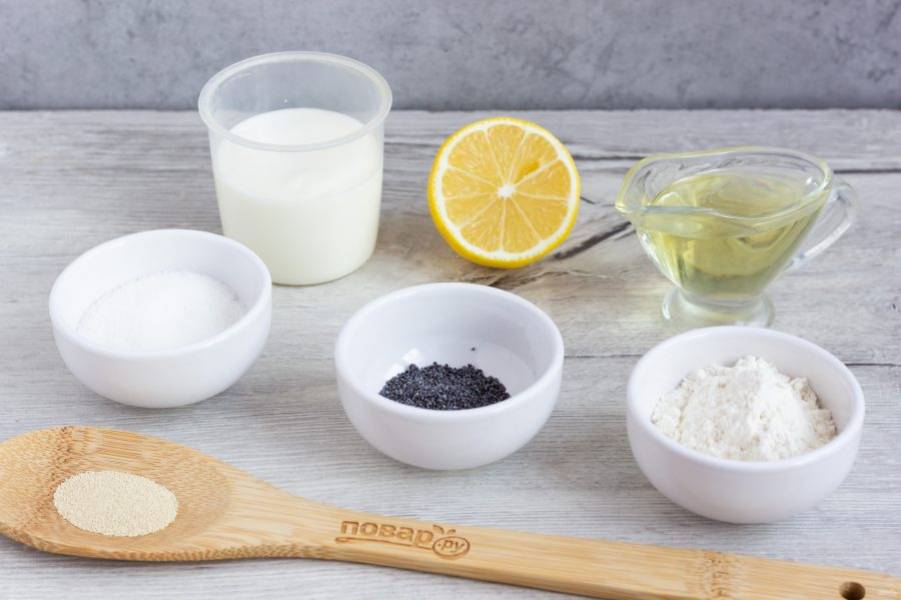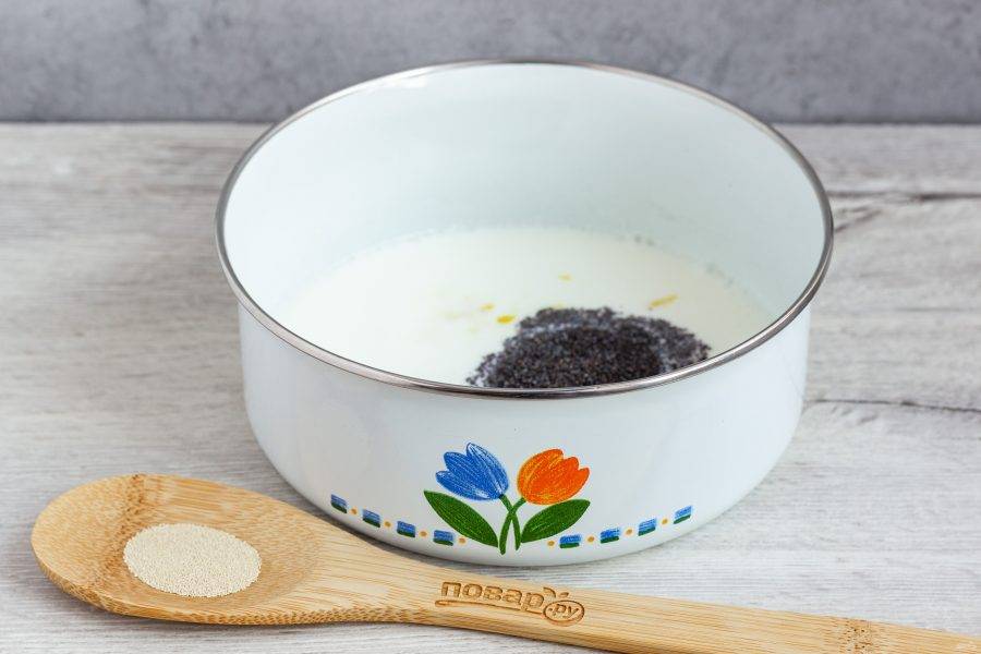 Кефир смешайте с водой, нагрейте до приятного для пальца тепла. Добавьте растертый мак и цедру лимона.