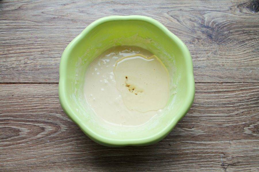 Влейте в тесто растительное масло и не сильно перемешайте.