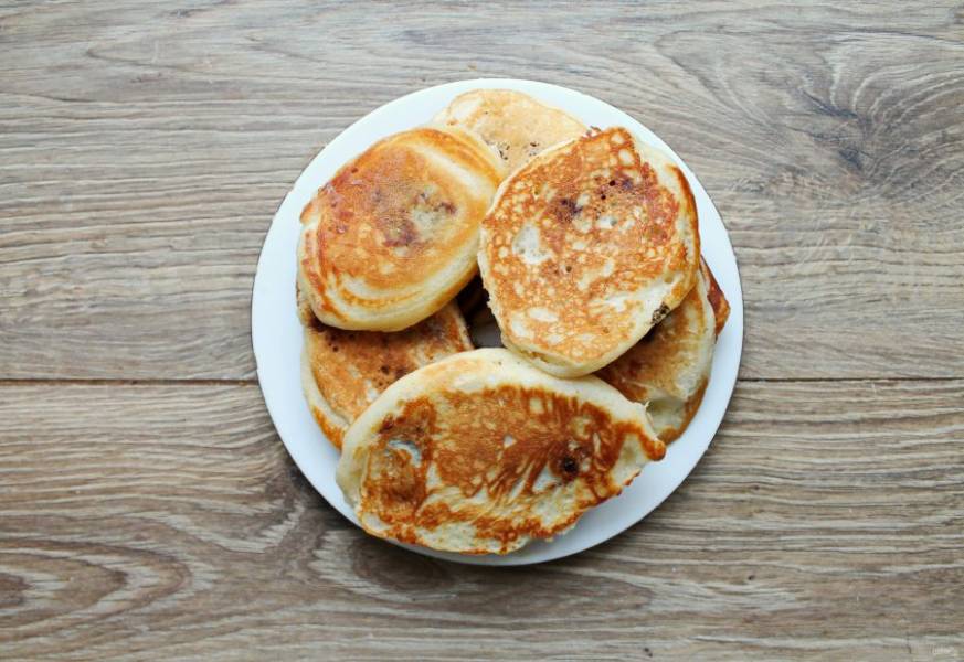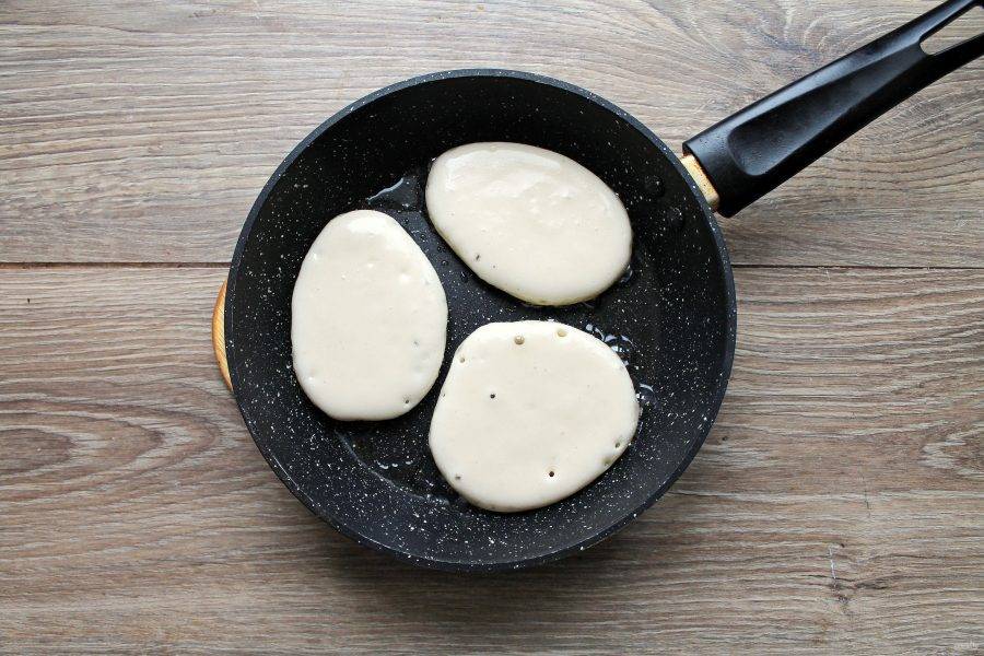 Дайте низу подрумяниться и переверните на другую сторону. Жарьте оладьи до румяной корочки и снимите.
