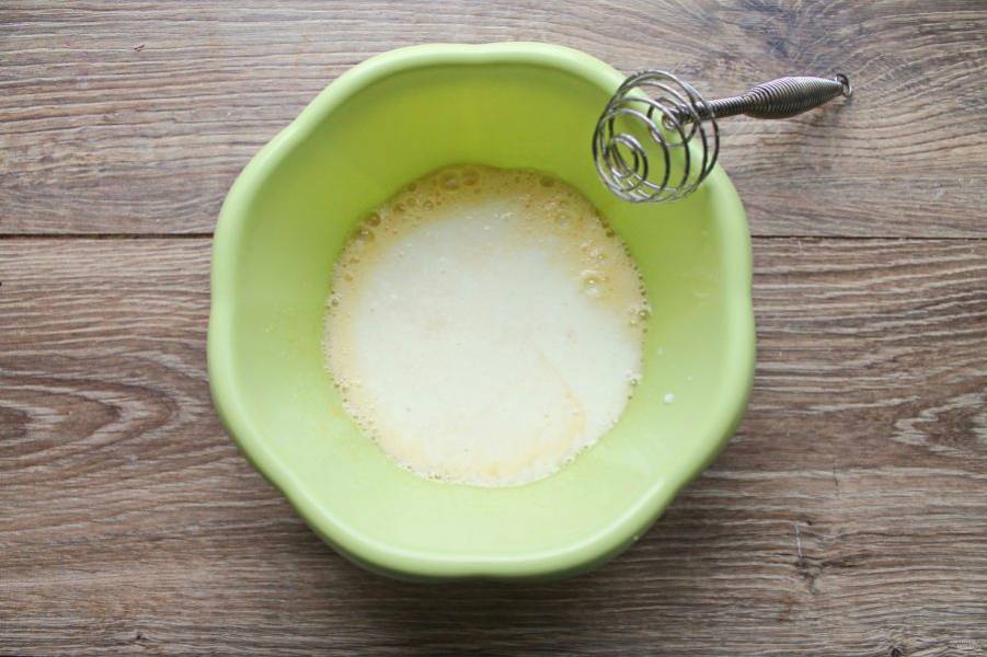 Влейте в миску теплый кефир и все хорошо перемешайте до однородности.