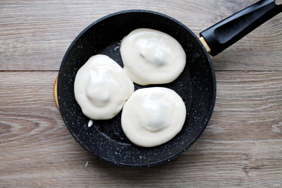 Сковороду смажьте растительным маслом и разогрейте. Выложите в сковороду по одной столовой ложки теста и дайте им немного поджарится.