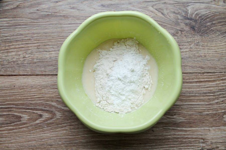 Муку смешайте с разрыхлителем и просейте в миску. Все хорошо перемешайте до густого, однородного теста.