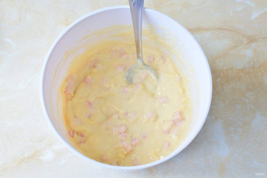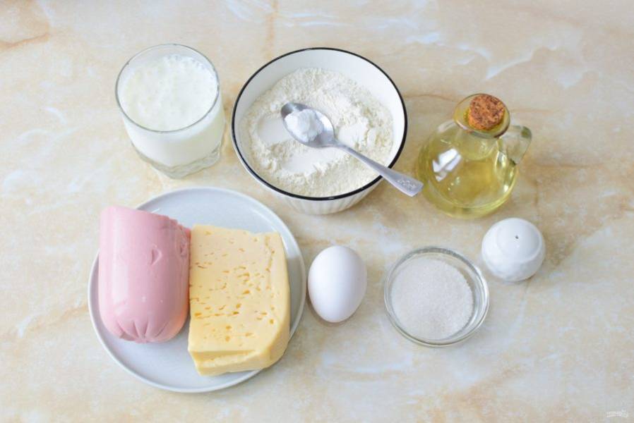 Чтобы приготовить оладьи с сыром и колбасой, подготовьте необходимые ингредиенты. Муку просейте через сито, чтобы насытить её кислородом.