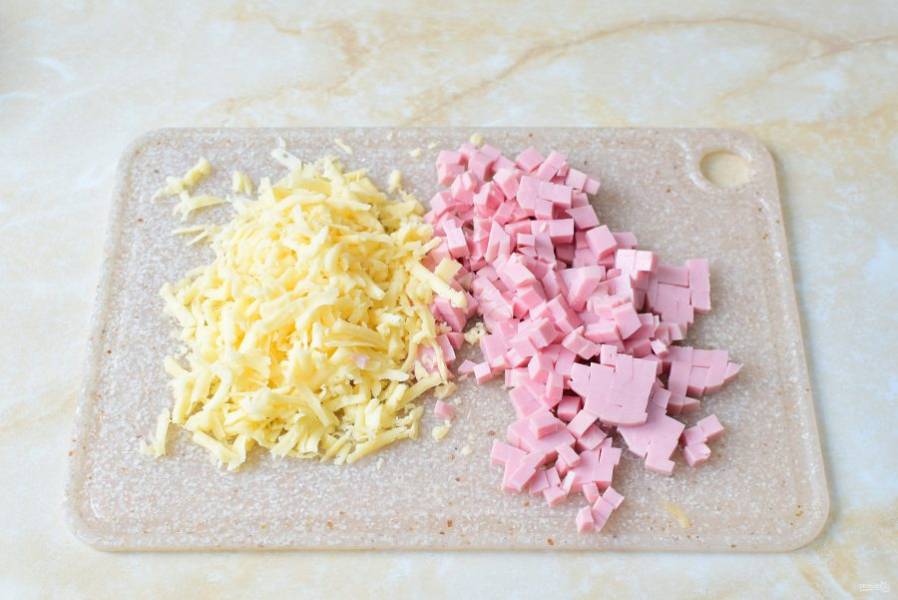 Вареную колбасы нарежьте мелким кубиком. Сыр потрите на крупной терке.