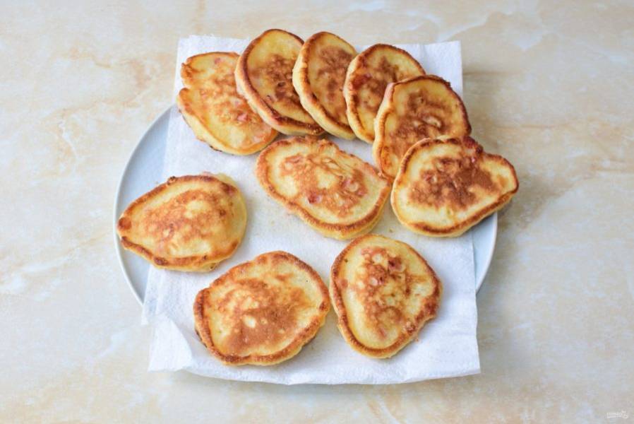 Оладьи выкладывайте на бумажное полотенце, чтобы пропитать с них лишнее масло.