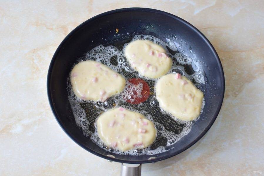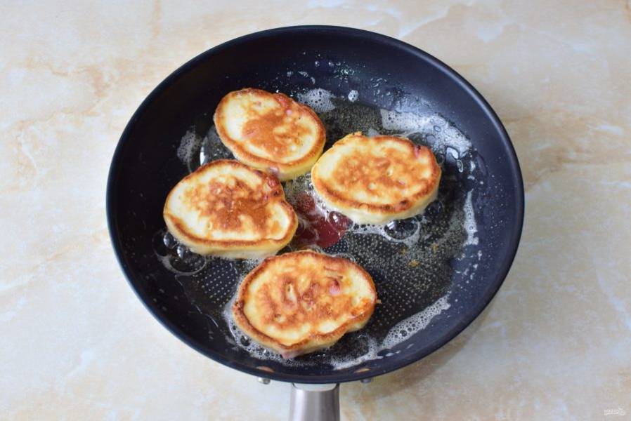 Готовьте оладьи на малом огне с двух сторон до золотистого цвета.