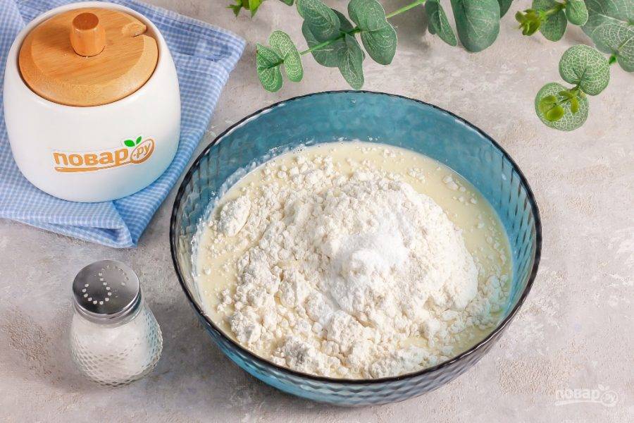 Всыпьте пшеничную муку высшего сорта и разрыхлитель. Аккуратно вмешайте сухие составляющие в жидкие. Тесто должно получиться гуще, чем для обычных блинов.