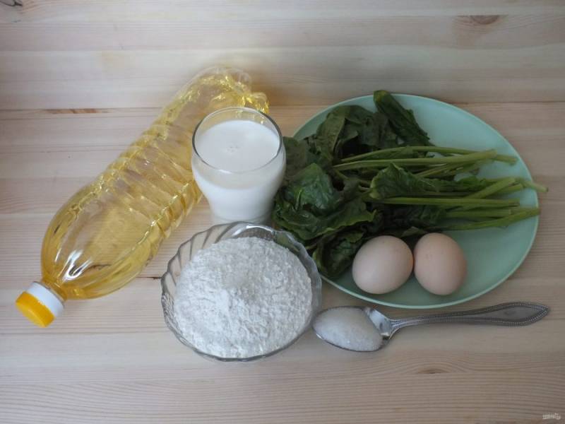 Подготовьте необходимые ингредиенты. Шпинат хорошо промойте. Удалите стебли, нам потребуются только листочки. Ряженку слегка подогрейте.