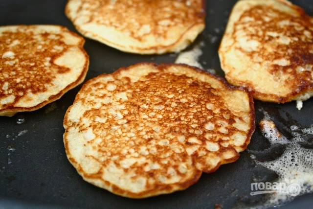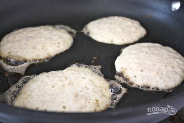 4. Разогрейте на сковороде растительное масло (можно пополам со сливочным). Выкладывайте ложкой тесто, жарьте оладьи на среднем огне с двух сторон до румяности.