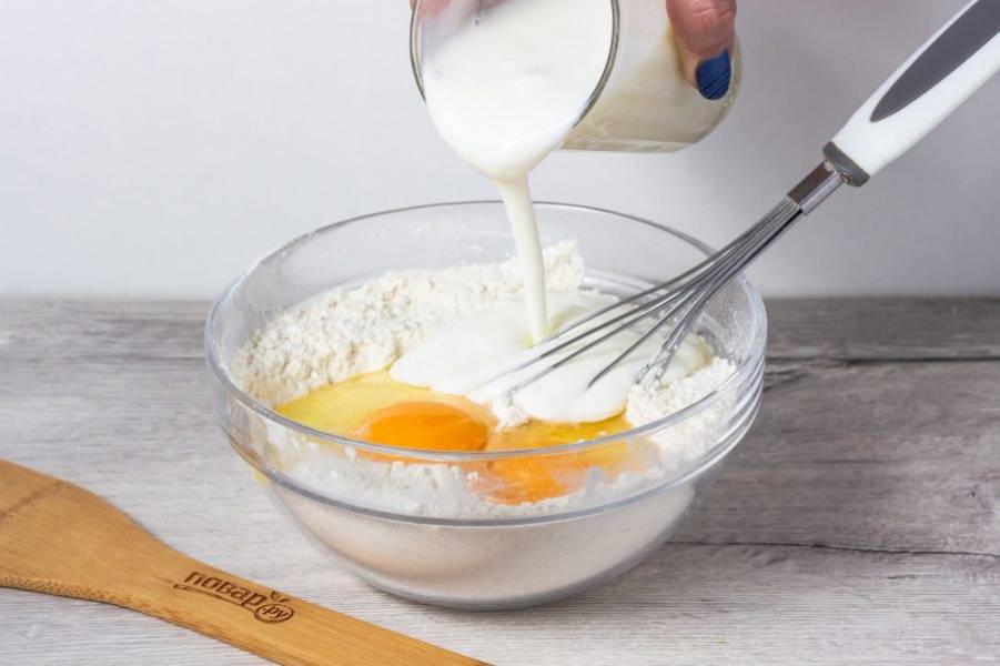 Добавьте яйца и кефир.
