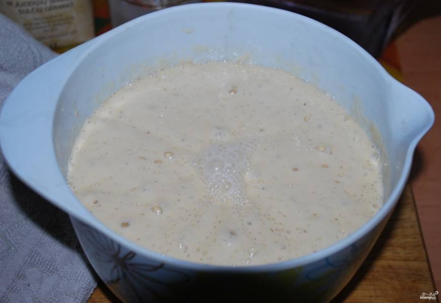 Сначала разведите в кефире комнатной температуры сахар с дрожжами, дайте дрожжам вступить в реакцию.
