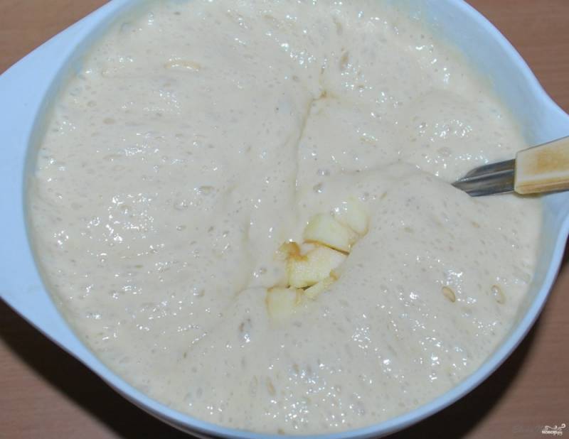 В поднявшееся тесто добавьте яблоки и перемешайте.