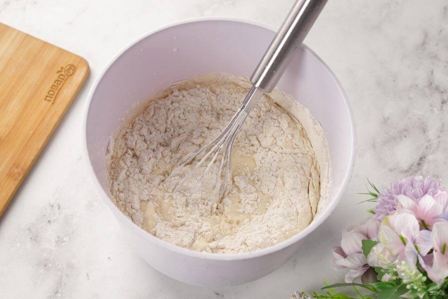 Не рекомендую использовать миксер, лучше вмешать муку в тесто при помощи обычного венчика.