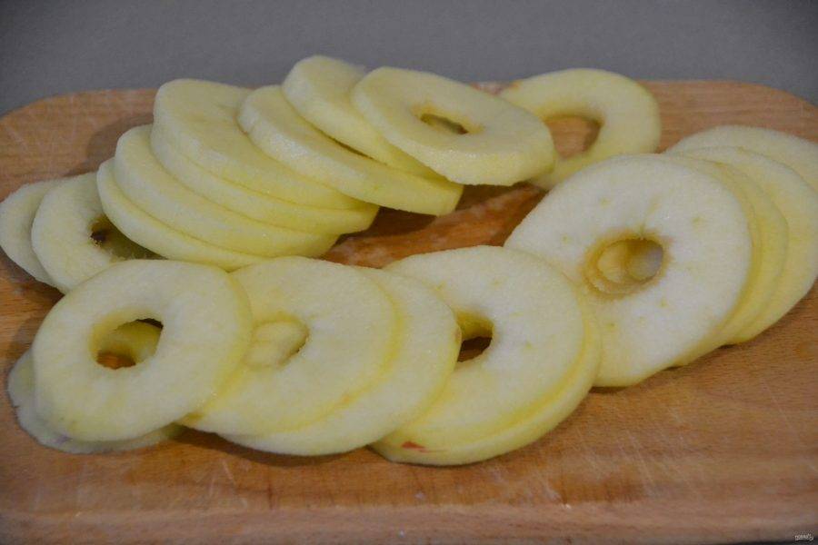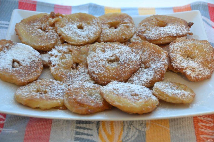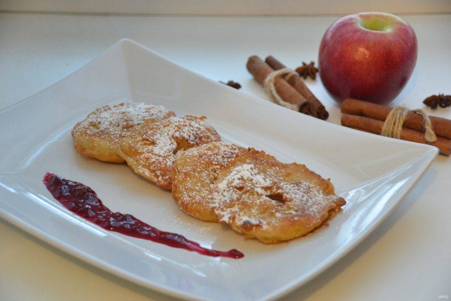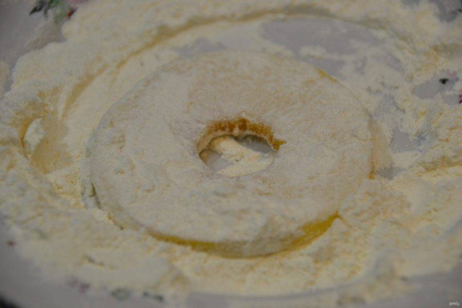Для того, чтобы кляр хорошо прилипал к яблоку, его лучше всего слегка обвалять в муке.