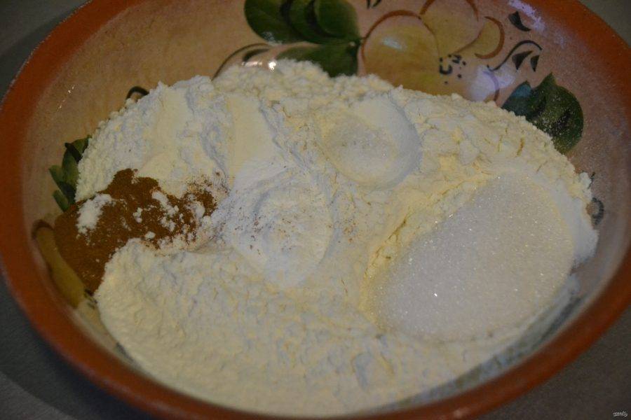 В отдельной миске смешайте все сухие ингредиенты: мука, сахарный песок, корица, соль и разрыхлитель.