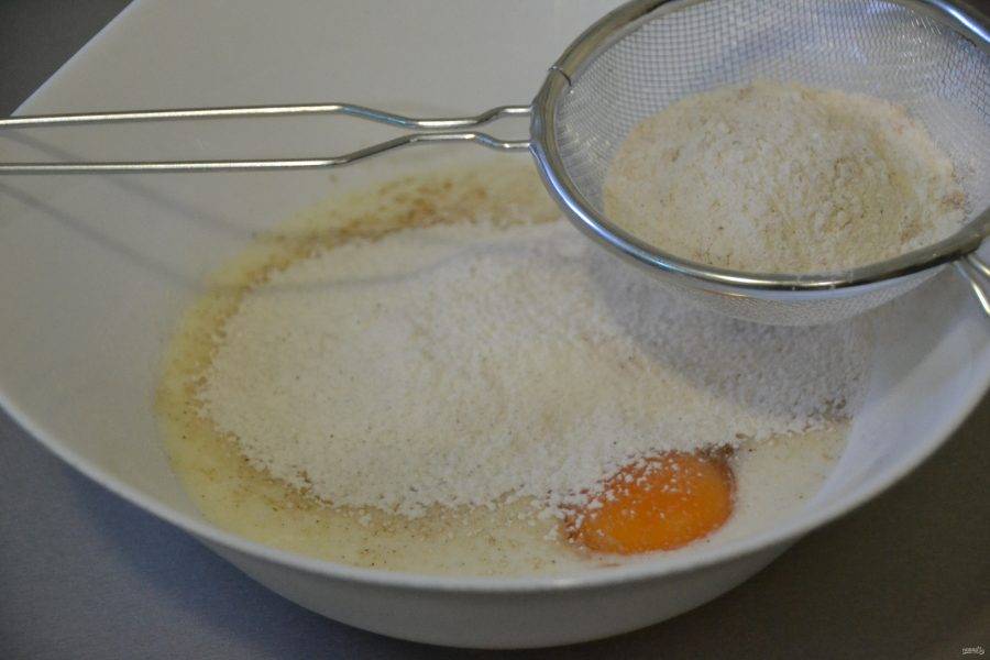 Просейте сухие ингредиенты в миску к молоку с яйцом.