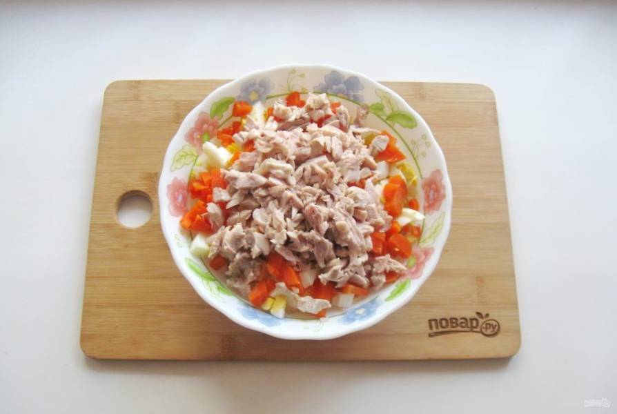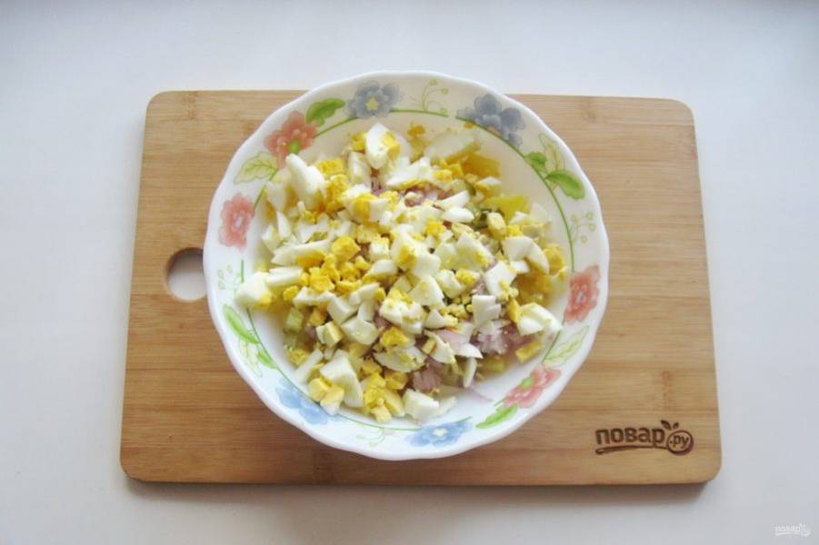 Яйца сварите, охладите и нарежьте. Добавьте в салат.