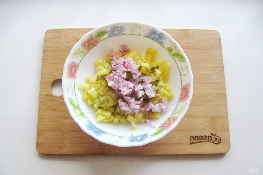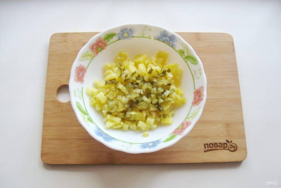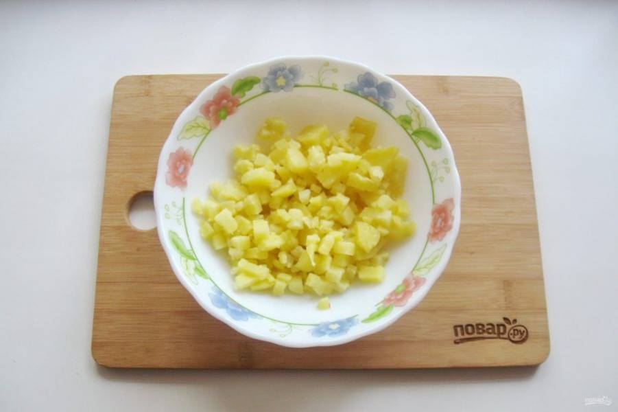 Картофель сварите, охладите и мелко нарежьте. Выложите в салатник.