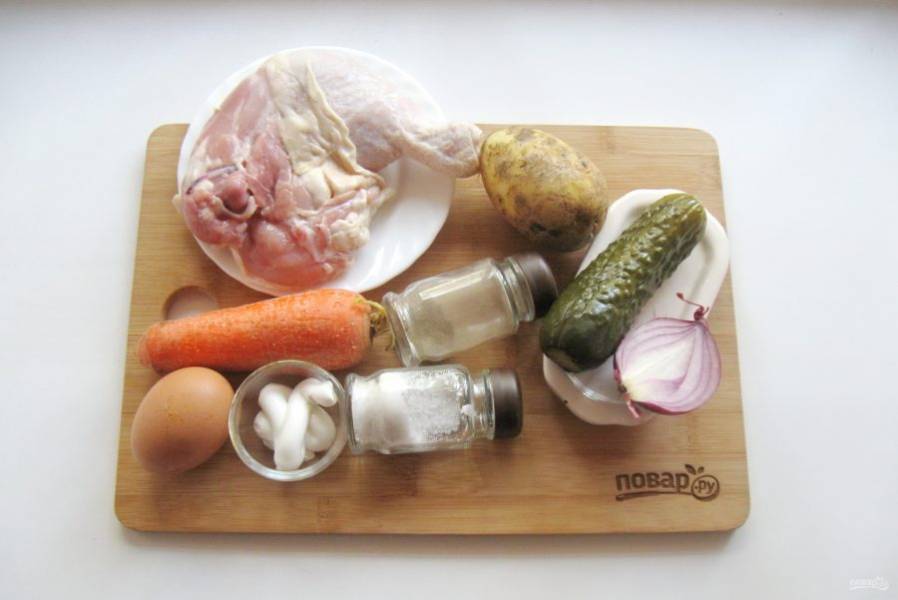 Курицу отварите до готовности. Бульон вам пригодится. Отделите мясо от костей и шкурки, мелко нарежьте и добавьте в салат.