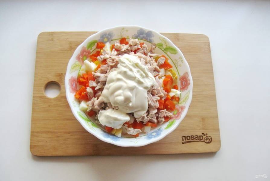 Заправьте салат сметаной и майонезом.