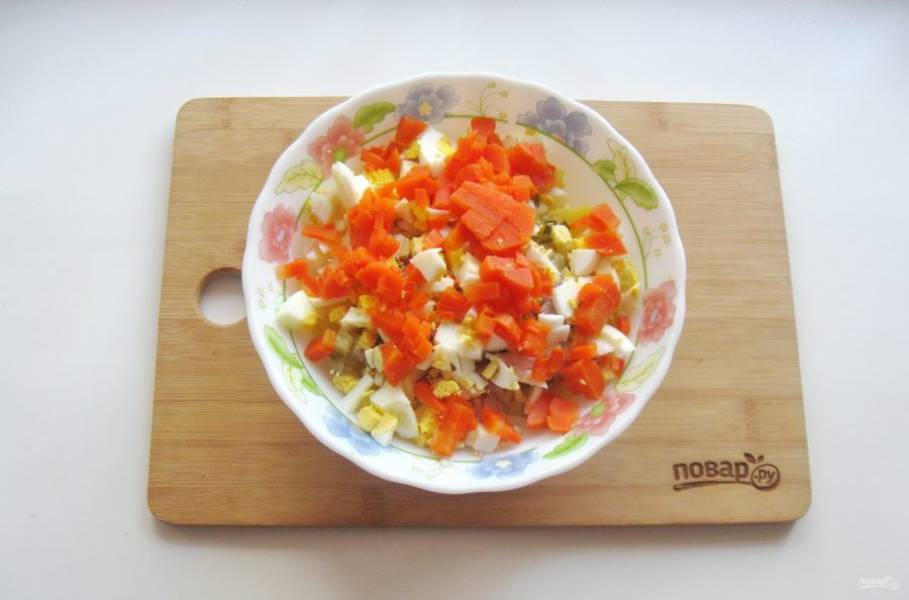 Морковь отварите, охладите, очистите, мелко нарежьте.