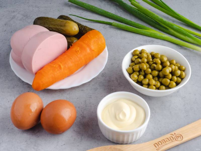 Подготовьте все необходимые ингредиенты. Яйца и морковь заранее отварите в подсоленной воде, остудите и почистите.