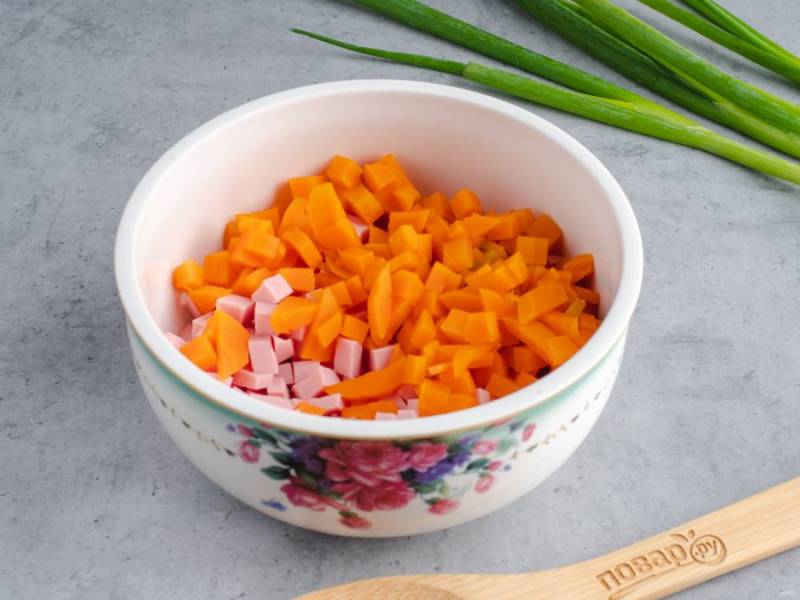 Нарежьте небольшими кубиками колбасу и морковь.