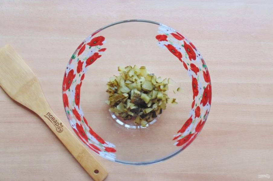 Маринованный огурец мелко нарежьте и выложите в салатник.